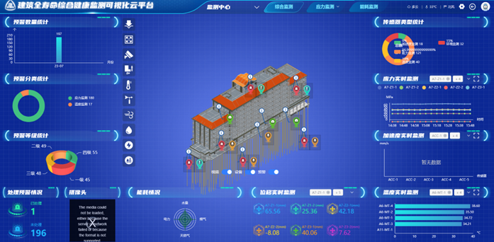 這一平臺就好比“醫(yī)生”為建筑穿上了一套復合監(jiān)測設備,使其擁有了24小時“體檢”與“聽診”服務,可以實時感知、監(jiān)測、識別、評定、預警和分析處理建筑的各項健康指標。無論是建筑的結構、幕墻,還是環(huán)境及能耗等,都可以在平臺上實時一體化監(jiān)測與關聯(lián)性監(jiān)測。