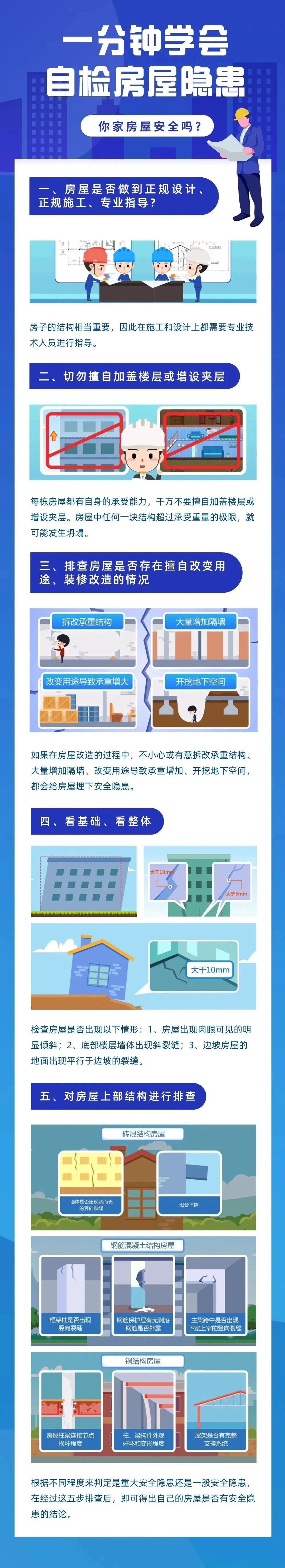 房屋是日常生產(chǎn)生活的重要場所,房屋安全與大家生活品質(zhì)息息相關。房屋像人一樣,會經(jīng)歷“生、老、病、死”,從出生到死亡,有病要治病,沒病要體檢。平時會出現(xiàn)一些“病害”,如果沒有及時發(fā)現(xiàn)、早日醫(yī)治,慢慢會演變成傾斜、折斷、坍塌等“重癥”乃至“死亡”。關于房屋安全,這些知識您要及早了解。