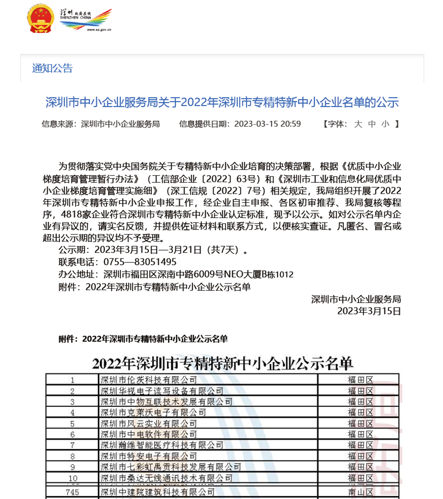 3月15日-21日,深圳市中小企業(yè)服務(wù)局對(duì)2022年深圳市專精特新中小企業(yè)名單進(jìn)行公示,深圳中建院建筑科技有限公司(簡(jiǎn)稱“深圳中建院”)獲得深圳市專精特新中小企業(yè)認(rèn)定。