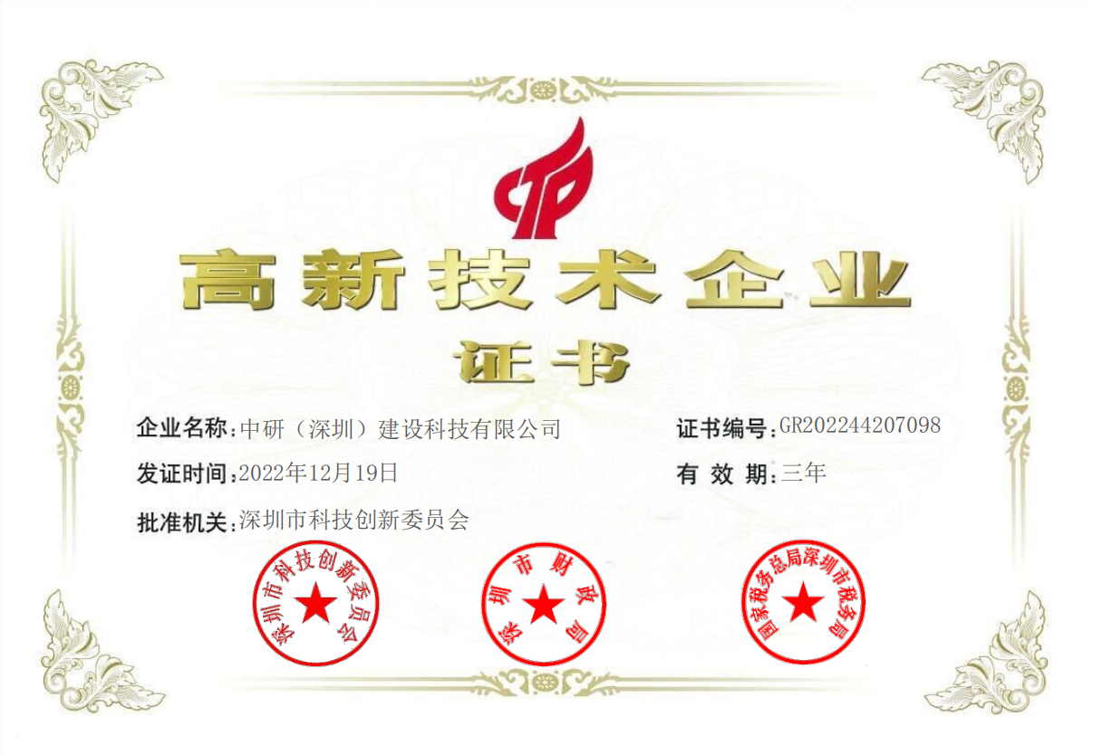 日前,中研(深圳)建設(shè)科技有限公司(下稱(chēng)中研科技)順利通過(guò)評(píng)審,獲得了國(guó)家高新技術(shù)企業(yè)認(rèn)定證書(shū)(證書(shū)編號(hào):GR202244207098),由此正式邁入國(guó)家高新技術(shù)企業(yè)行列,開(kāi)啟新篇章。