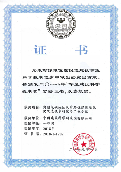中國(guó)建筑科學(xué)研究院有限公司深圳分公司與上海市建筑科學(xué)研究院(集團(tuán))有限公司、哈爾濱工業(yè)大學(xué)共同完成的“十二五”國(guó)家科技支撐計(jì)劃課題《典型氣候地區(qū)既有居住建筑綠色化改造技術(shù)研究與工程示范》榮獲2018年華夏建設(shè)科學(xué)技術(shù)獎(jiǎng)一等獎(jiǎng)。
