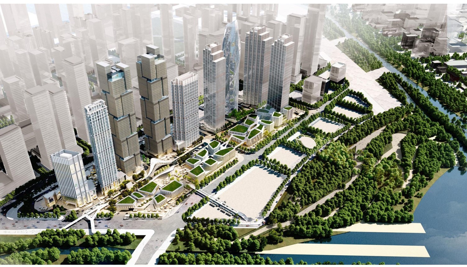 整個(gè)園區(qū)以縱橫兩條綠軸作為建筑群的幾何主軸,疊加三條南北貫穿的斜線,勾勒出整個(gè)夢(mèng)幻小鎮(zhèn)的自由與開放的城市肌理。在前海企業(yè)公館建筑群中,所有的街道都是公共開敞的,行人可以隨意穿行,將街巷、院落歸還于公眾。整個(gè)園區(qū)與前海深港合作區(qū)自由的氣質(zhì)相輔相成,相得益彰,為深圳發(fā)展倍添活力。