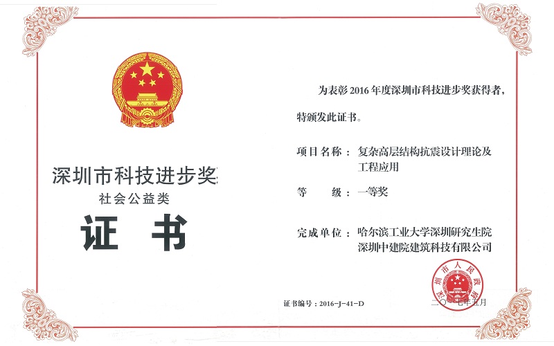 2017年 9月21日下午,深圳召開全市科學(xué)技術(shù)獎(jiǎng)勵(lì)大會(huì),市長陳如桂主持大會(huì),省委常委、市委書記王偉中出席大會(huì)并講話,副市長艾學(xué)峰通報(bào)全市創(chuàng)新驅(qū)動(dòng)發(fā)展情況,并宣讀關(guān)于頒發(fā)2016年度深圳市科學(xué)技術(shù)獎(jiǎng)的通報(bào)。其中,以哈爾濱工業(yè)大學(xué)(下稱哈工大)滕軍教授和我院深圳中建院建筑科技有限公司(下稱中建院)何春凱研究員等作為主要參與人,哈工大和中建院共同完成的課題《復(fù)雜高層結(jié)構(gòu)抗震設(shè)計(jì)理論及工程應(yīng)用》榮獲2016年度深圳市科技進(jìn)步獎(jiǎng)一等獎(jiǎng)。