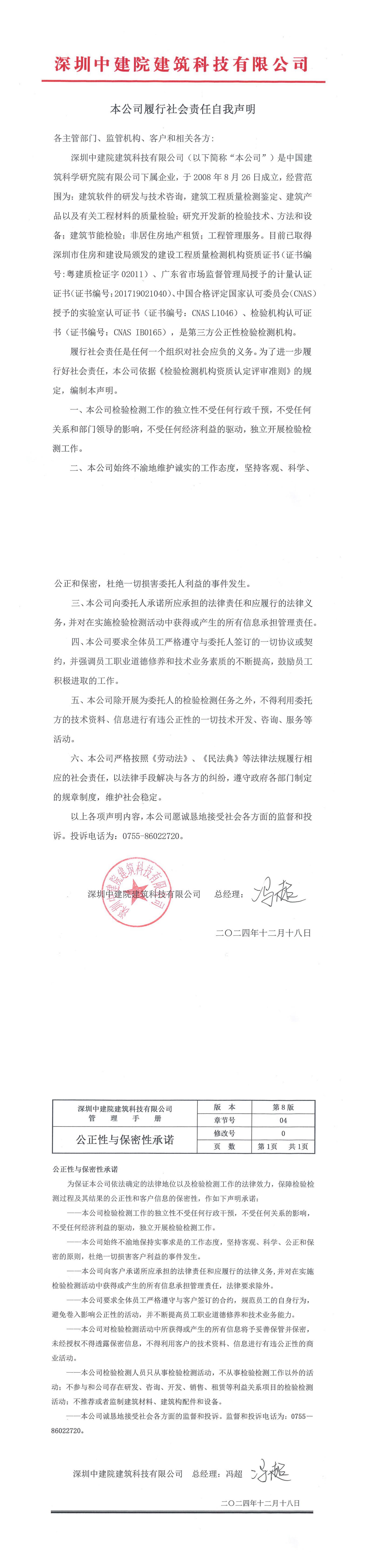 深圳中建院履行社會責(zé)任自我聲明、公正性與保密性承諾